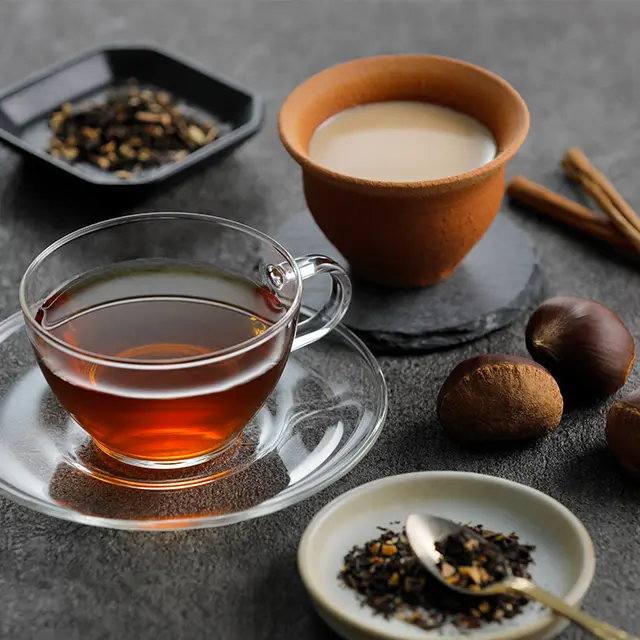 バニラを加え、ふわりと広がるマロンクリームのような甘美な香りとカカオハスクの奥深さを楽しむ上質な大人のブレンドティー。